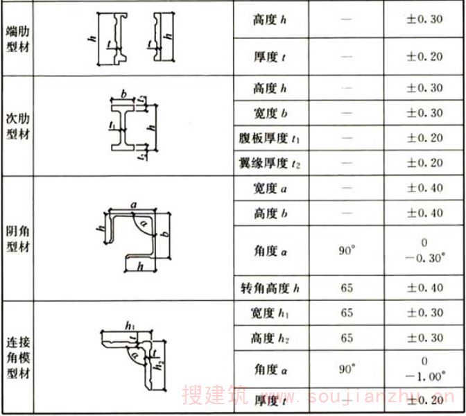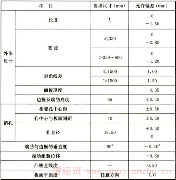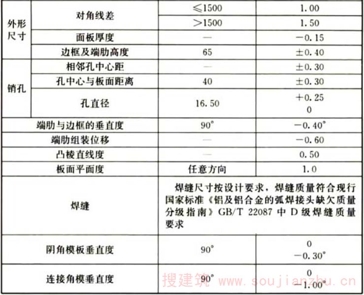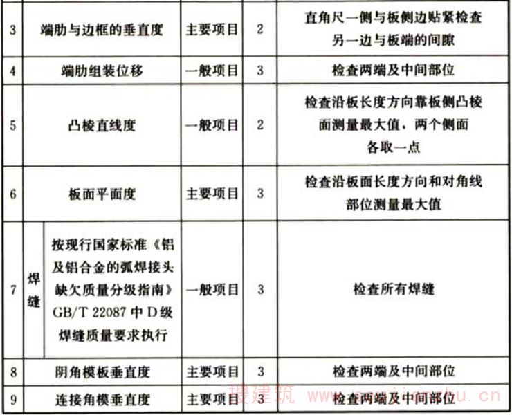 C.0.2面板厚度影响模板刚度,进而影响混凝土成型后的平整度,为主要项目。单件模板加工过程中,销孔沿板长度方向的中心距、宽度方向的中心距控制板面的平整度,影响模板系统的垂直度,为主要项目。型材凸棱设计主要是加强铝合金模板的边框强度,一般不影响模板成型后浇捣混凝土的质量,为一般项目。端肋与边框的垂直度影响模板的耐久性及混凝土成型后的垂直度,考虑为主要项目。板面平面度影响拆模后墙、柱、梁及楼板平整度,为主要项目。焊缝必须全部检查,但不直接影响模板平整度、垂直度,考虑为一般项目。连接角模偏差在铝型材出厂已经确定,影响天花与梁、柱的垂直度,考虑为主要项目。