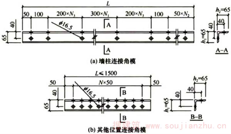 2.1.3转角模板用于连接相互垂直的模板。楼板阴角模板、梁底阴角模板、梁侧阴角模板的截面形式、孔距要求一致,仅标准长度和所用部位不同。