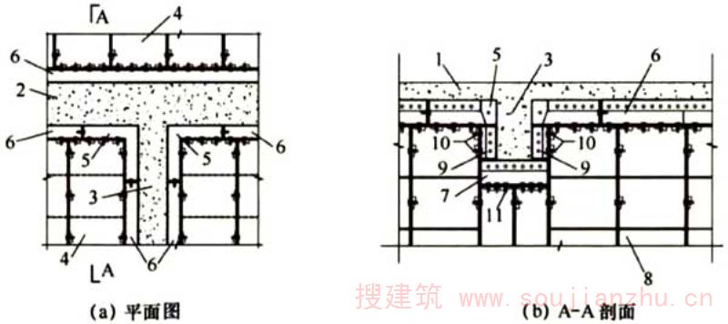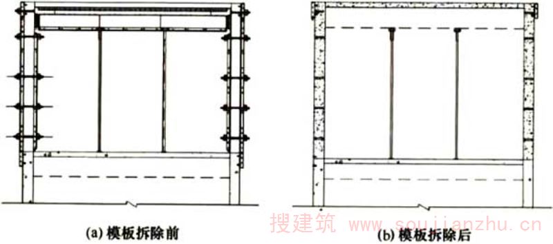 2.1.6、2.1.7早拆是指利用混凝土的早期强度和早拆装置的特殊构造,将楼板模板和梁底模板先行拆除而保留早拆头和竖向支撑的施工技术。利用早拆可提高平面模板的周转使用速度。