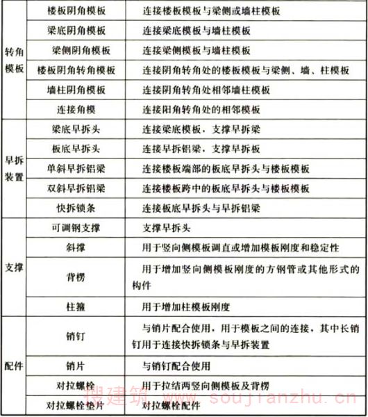 用于支撑铝合金模板、加强模板整体刚度、调整模板垂直度、承受模板传递的荷载的部件,包括可调钢支撑、斜撑、背楞、柱箍等。