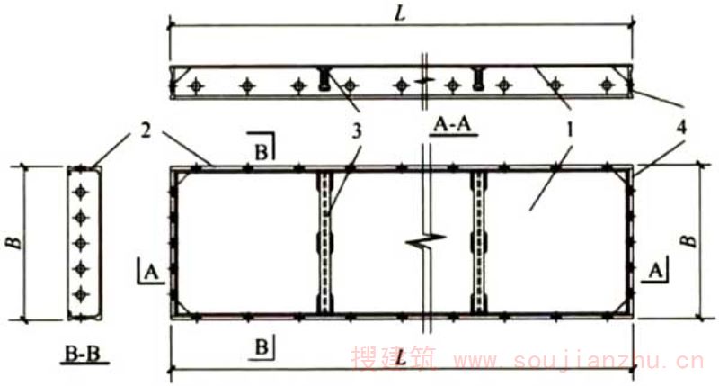 图2平面模板示意图 1-面板;2-边框;3-次肋;4-端肋