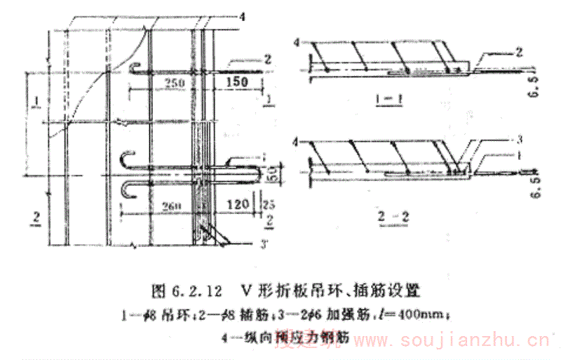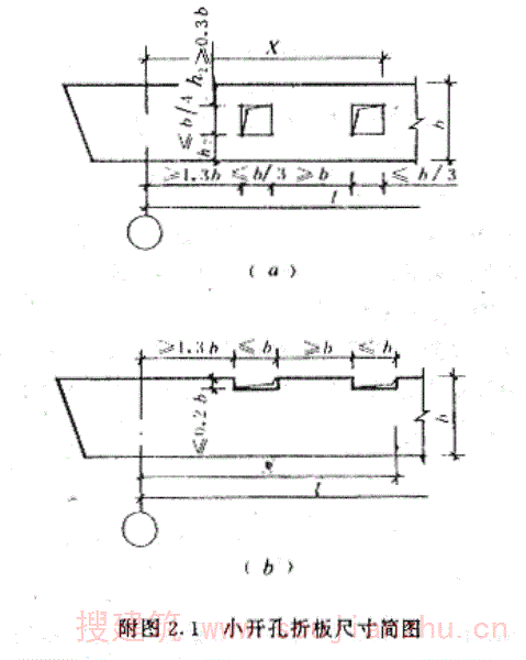 1满足附图2.1(a)、附图2.1(b)中规定尺寸的开孔为小开孔V形折板。图中h2应大于主筋带宽度。