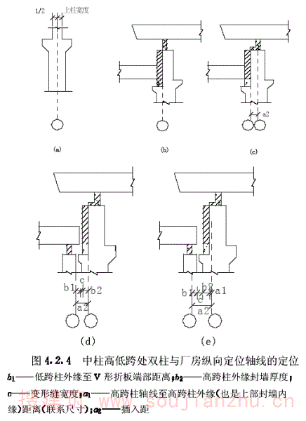 一、等高厂房的中柱,其上柱的中心线应与厂房纵向定位轴线相重合(图4.2.4a);