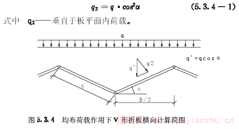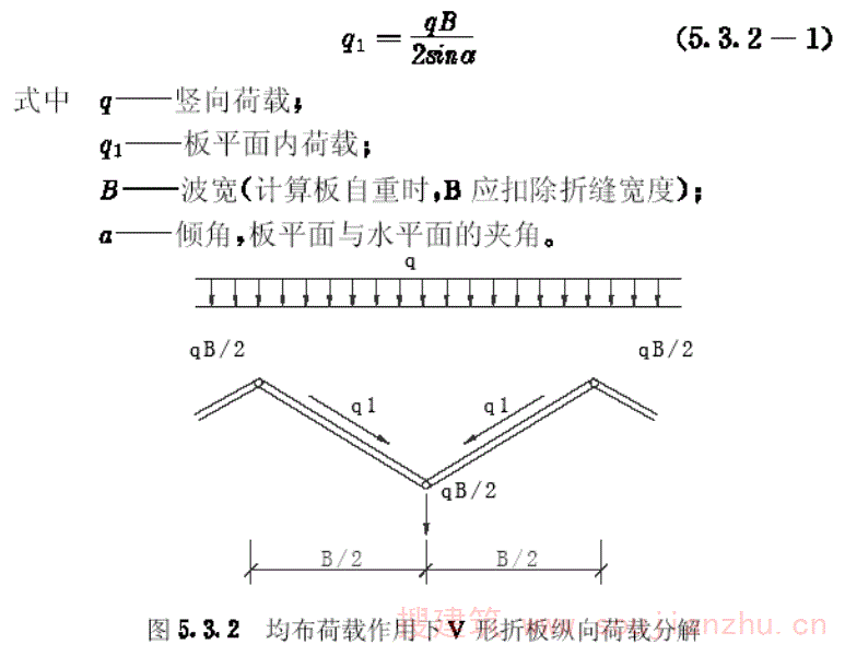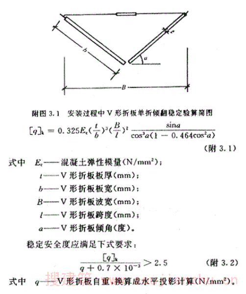 安装过程中一般应作单体V形折板的单折倾翻稳定验算,所设临时拉杆间距符合本规程时,V形折板整体失稳的临界荷载标准值,可按下式计算(附图3.1):