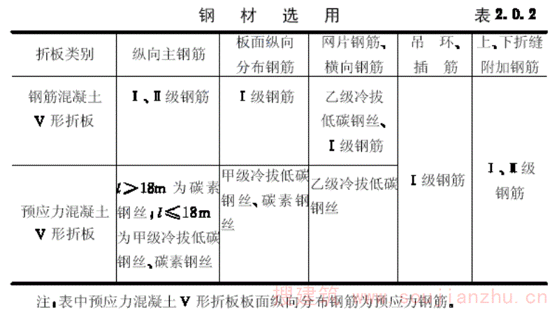 第2.0.2条 V形折板所用的钢材,可按表2.0.2规定选用。其中用作吊环、插筋的钢材不得冷加工。