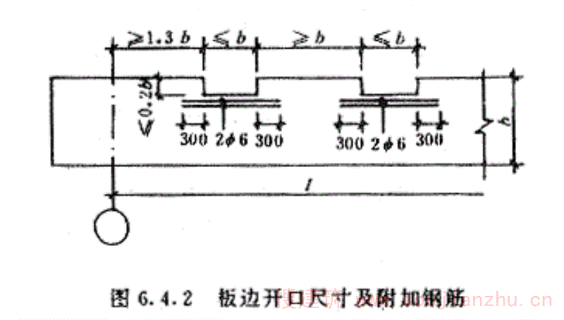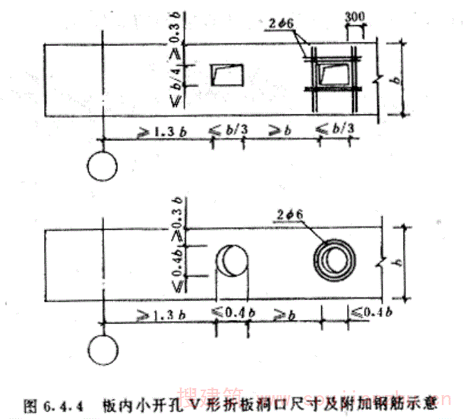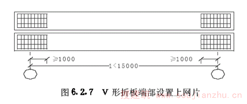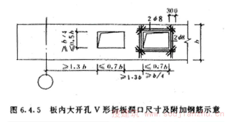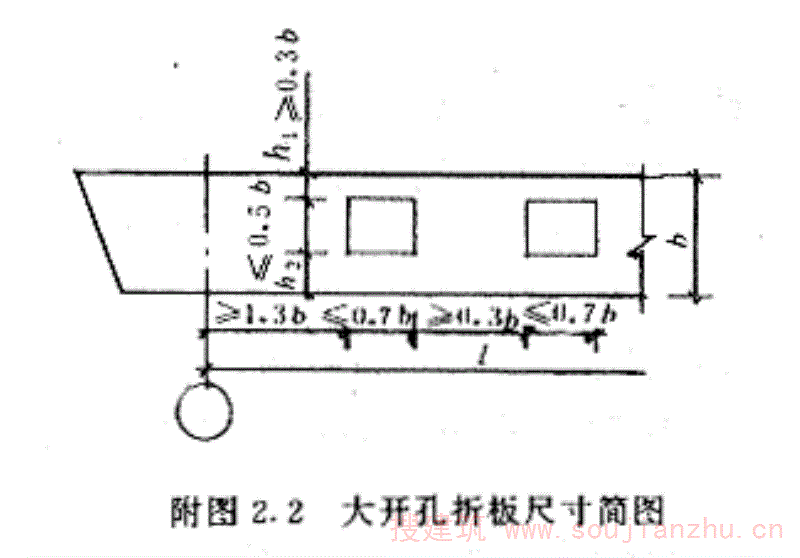 2开孔尺寸满足附图2.2中规定的尺寸为大开孔V形折板。图中h2应大于主筋带宽度。