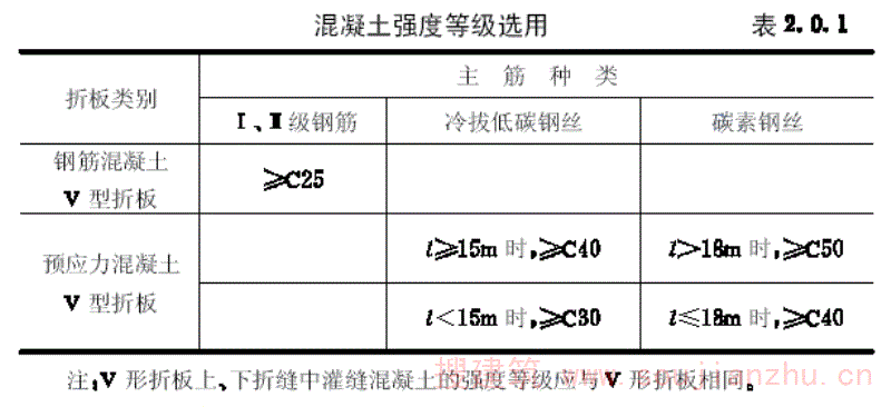第2.0.1条 V形折板的混凝土强度等级,可按表2.0.1的规定选用。