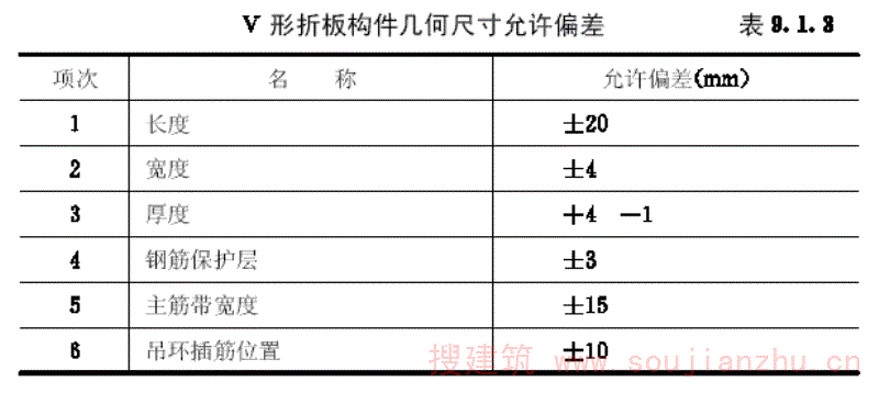 第9.1.3条 V形折板外形几何尺寸的允许偏差,应符合表9.1.3中的规定。允许偏差项目的抽查点的70%达到设计要求时,方为合格。V形折板构件的抽查数量,应不小于构件总数的5%,且不少于3折。