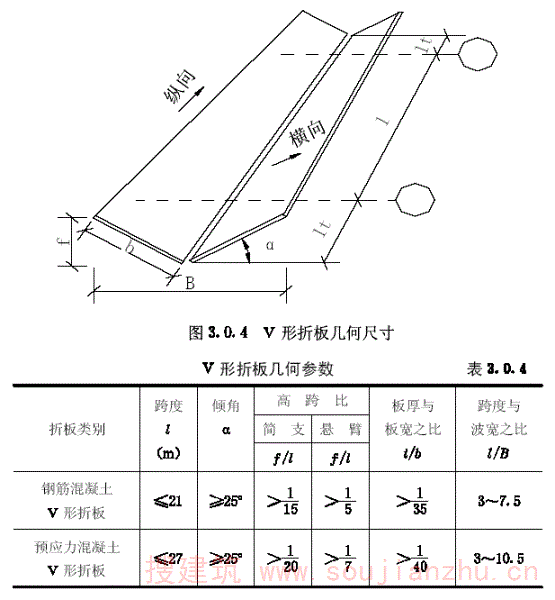 第3.0.4条 V形折板的几何参数宜按表3.0.4选用,几何尺寸见图3.0.4。悬臂长度不宜大于6m。