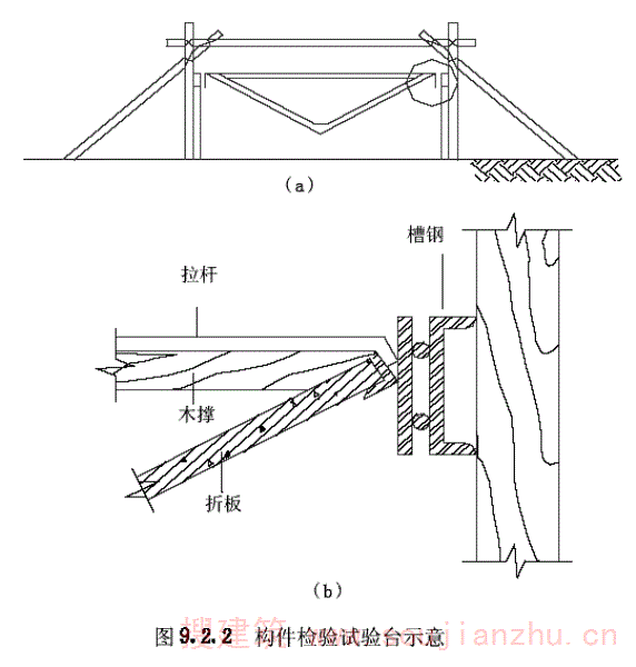 第9.2.2条 V形折板构件可取出一个单折,模拟V形折板屋盖内折的受力状态作结构性能检验(图9.2.2a)。试验时应重视V形折板的纵向边界条件,防止过早失稳。纵向支撑应满足V形折板能垂直自由变位,约束水平变位(图9.2.2b)。
