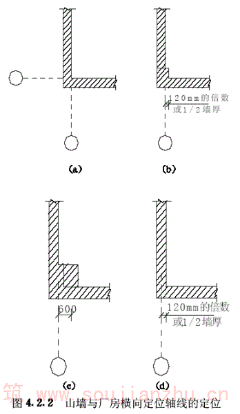 二、当山墙厚度大于240mm时,墙内缘与厂房横向定位轴线的距离,宜为120mm的倍数或1/2墙厚;当为柱承重时,轴线与柱中线的距离为600mm(图4.2.2c、d)。