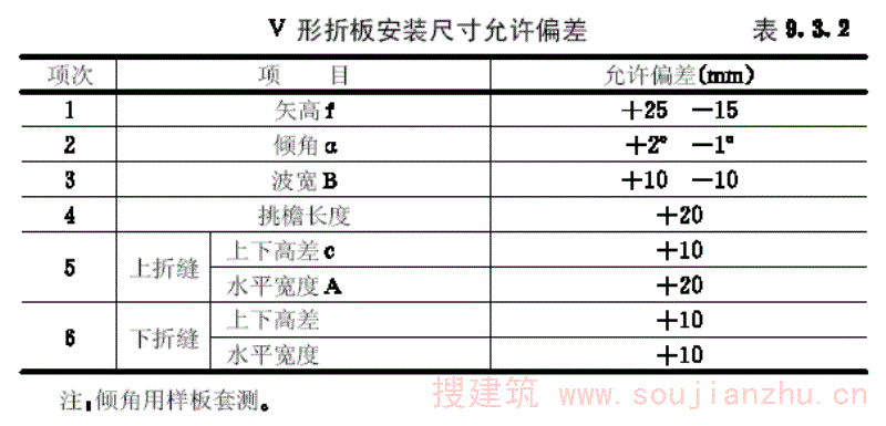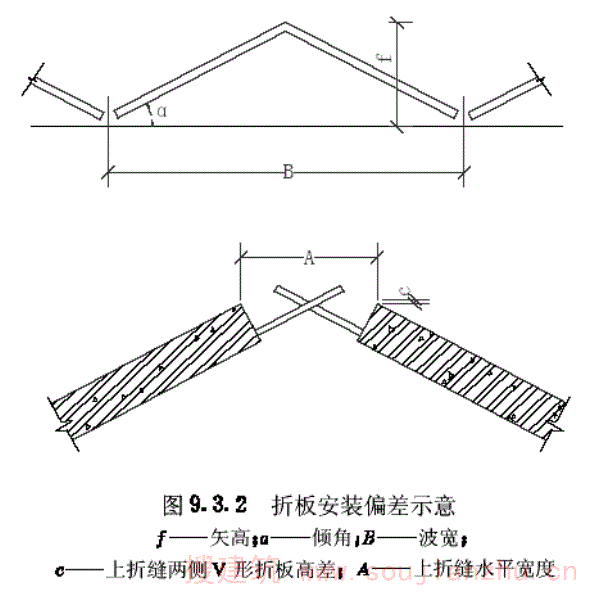 第9.3.2条 V形折板屋盖安装后,应对其倾角、矢高、上下折缝等部位进行检测(图9.3.2),允许偏差应符合表9.3.2中的规定。