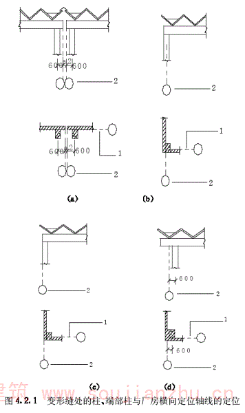 3端部柱中心线自厂房横向定位轴线内移600mm(图4.2.1d)。
