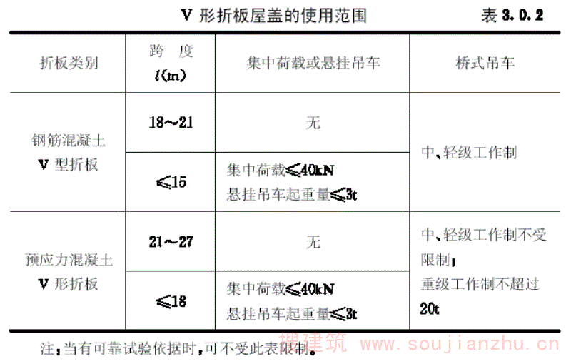 第3.0.2条 V形折板屋盖的使用范围应满足表3.0.2的要求。