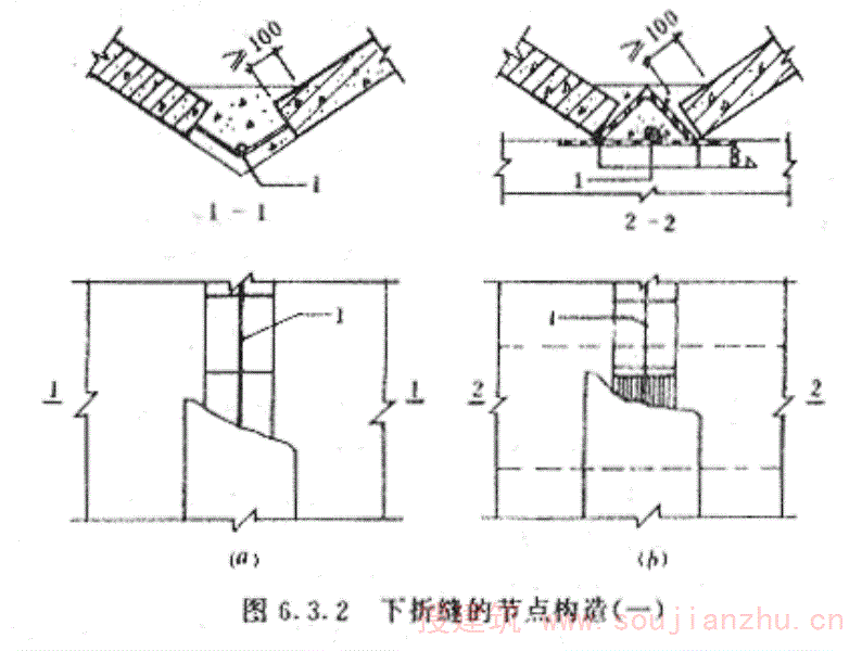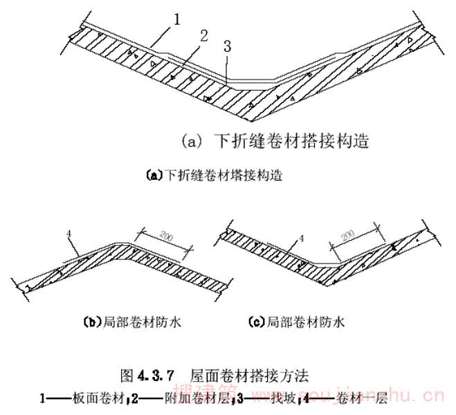 第4.3.7条 V形折板屋面应认真做好防水工程。当铺设卷材时,宜垂直于V形折板跨度方向。下折缝处卷材的搭接构造,可参见图4.3.7a的形式。