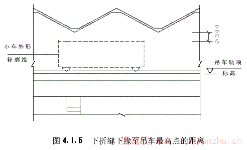 第4.1.5条 V形折板屋盖下折缝下缘至桥(梁)式吊车最高点的距离。应不小于300mm(图4.1.5),以满足吊车安装检修的要求。