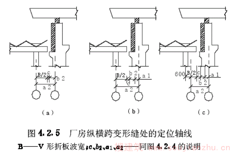 第4.2.5条 纵横跨变形缝处应设两条定位轴线,其插入距a2值应为变形缝的宽度c加高跨处外缘封墙厚度b2加边折的1/2波宽(图4.2.5a);或为变形缝的宽度c加高跨处外缘封墙厚度b2加边折的1/2波宽及联系尺寸a1(图4.2.5b、c)。