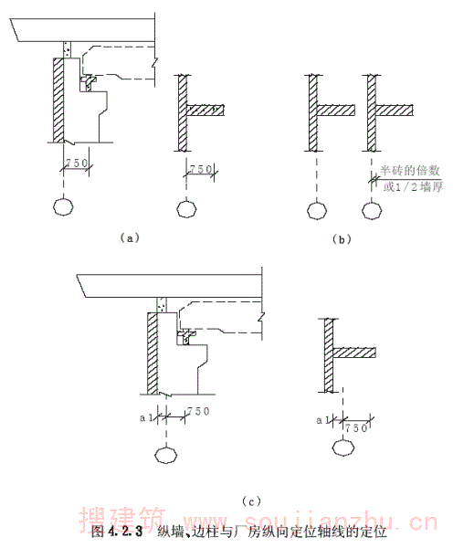 二、当纵墙承重并设有壁柱时,墙内缘宜与厂房纵向定位轴线相重合。当不重合时,墙内缘与厂房纵向定位轴线的距离宜为半砖(即120mm)的倍数或1/2墙厚(图4.2.3b);
