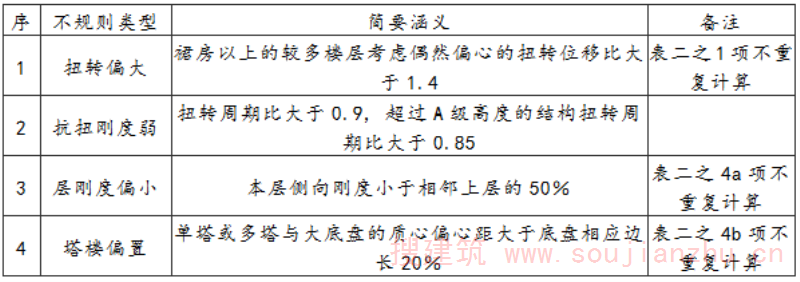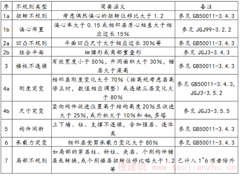 注:深凹进平面在凹口设置连梁,当连梁刚度较小不足以协调两侧的变形时,仍视为凹凸不规则,不按楼板不连续的开洞对待;序号a、b不重复计算不规则项;局部的不规则,视其位置、数量等对整个结构影响的大小判断是否计入不规则的一项。