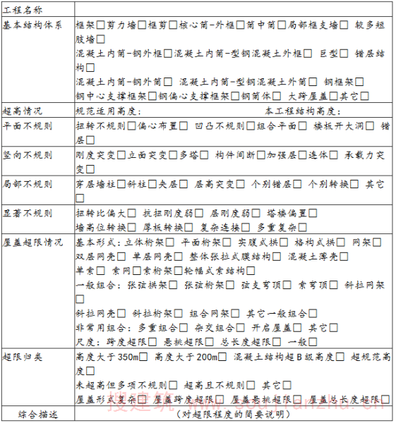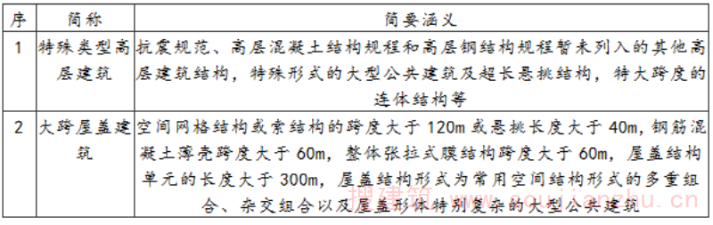 说明:具体工程的界定遇到问题时,可从严考虑或向全国超限高层建筑工程审查专家委员会、工程所在地省超限高层建筑工程审查专家委员会咨询。