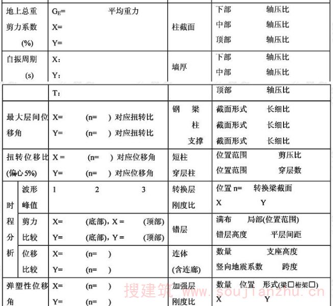 六、结构分析主要结果。对高度超限和规则性超限工程包括:控制的作用组合;计算软件;总剪力和周期调整系数,结构总重力和地震剪力系数,竖向地震取值;纵横扭方向的基本周期;最大层位移角和位置、扭转位移比;框架柱、墙体最大轴压比;构件最大剪压比和钢结构应力比;楼层刚度比;框架部分承担的地震作用;时程法采用的地震波和数量,时程法与反应谱法主要结果比较;隔震支座的位移。对屋盖超限工程包括:控制工况和作用组合;计算软件和计算方法;屋盖挠度和支承结构水平位移;屋盖杆件最大应力比,屋盖主要竖向振动周期,支承结构主要水平振动周期;屋盖、整个结构总重力和地震剪力系数;支承构件轴压比、剪压比和应力比;薄壳、网壳和拱的稳定系数;时程法采用的地震波和数量,时程法与反应谱法主要结果比较等。
