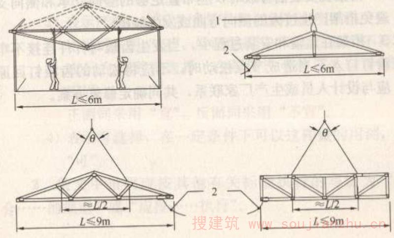 1 当桁架跨度为L≤6m时,可采用单点起吊,或采用人工搬运;