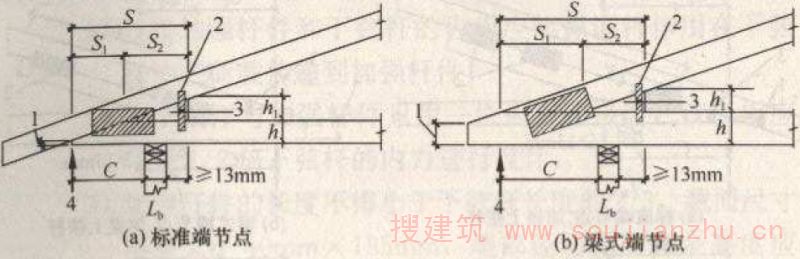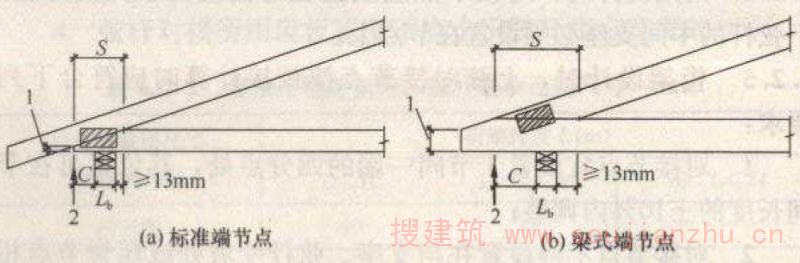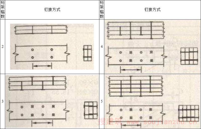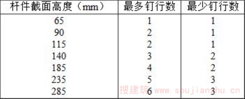 2 当两个弦杆之间承受压力,且弦杆之间间隙小于2mm时,上弦杆之间的每块钉板两端各所需钉子数量按构造要求不少于2颗;
