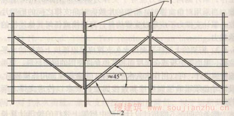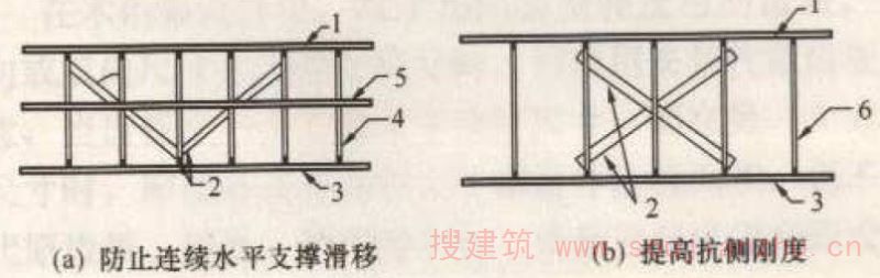 E.0.2 桁架在安装前存放时,应布置足够的竖向支承和侧向支撑,避免桁架产生过大的侧向弯曲或发生倾覆。