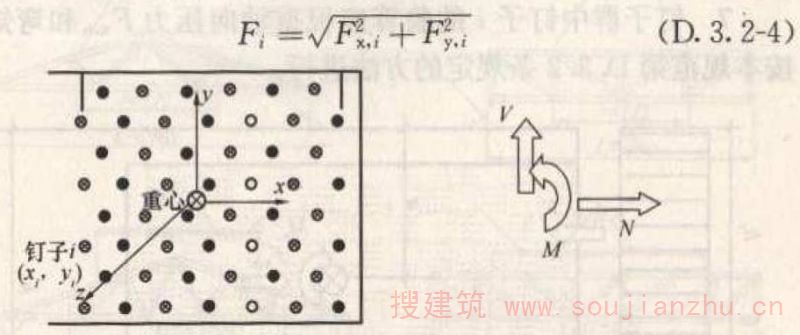 1 假设作用于钉板上的轴力、剪力和力矩作用于钉子群的重心点(图D.3.2);