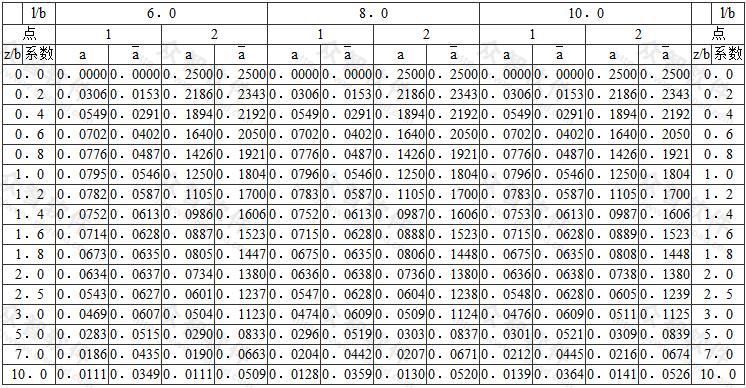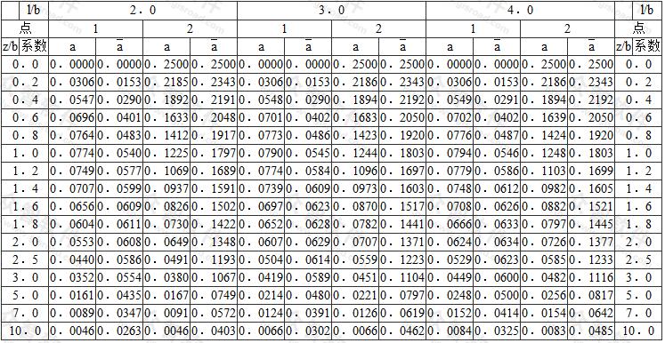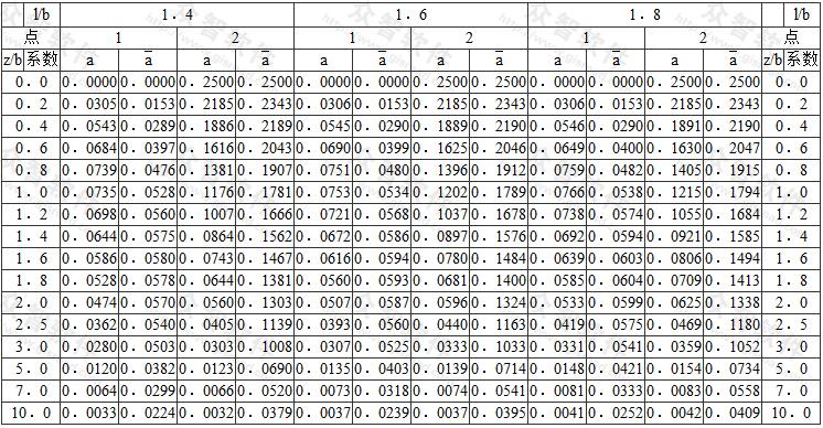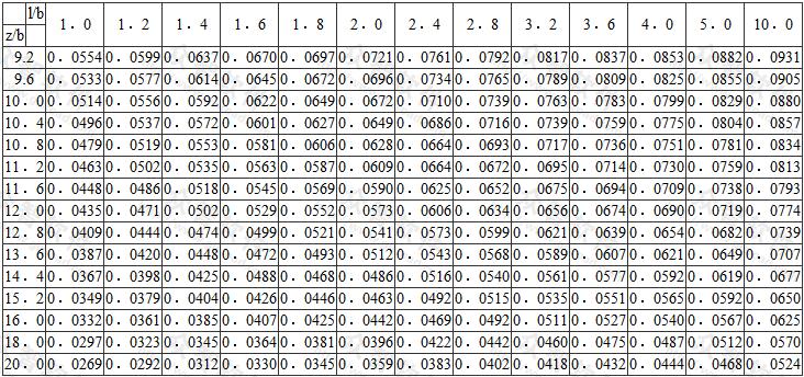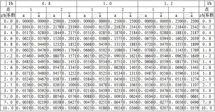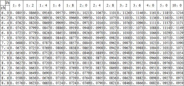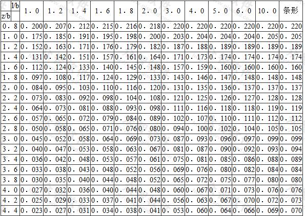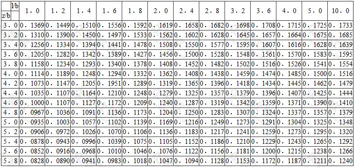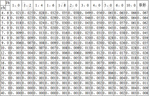注:l——矩形均布荷载长度(m);b——矩形均布荷载宽度(m);z——计算点离基础底面或桩端平面垂直距离(m)。