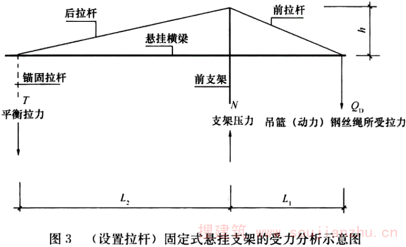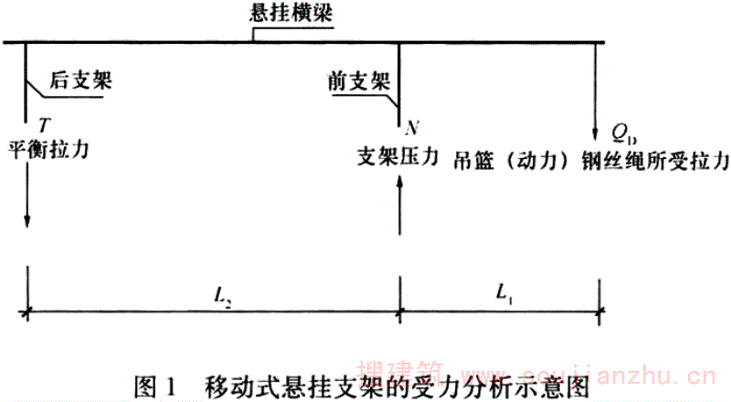 一端固定在附墙支座上,悬挂升降设备或防坠落装置的悬挑钢梁,又称悬吊梁。