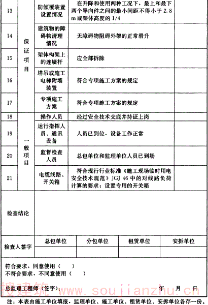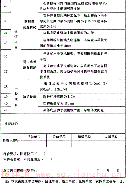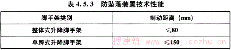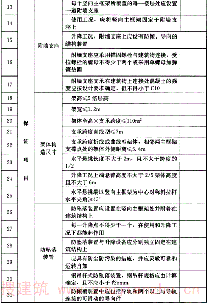 8.1.3~8.1.6 条文对附着式升降脚手架的各个验收项目的内容进行了规定。