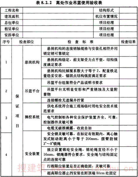 8.2.2 本条对高处作业吊篮的各个验收项目的内容进行了规定。