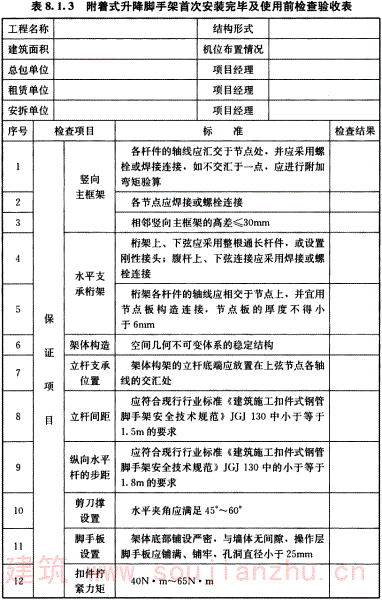 8.1.3 附着式升降脚手架首次安装完毕及使用前,应按表8.1.3的规定进行检验,合格后方可使用。