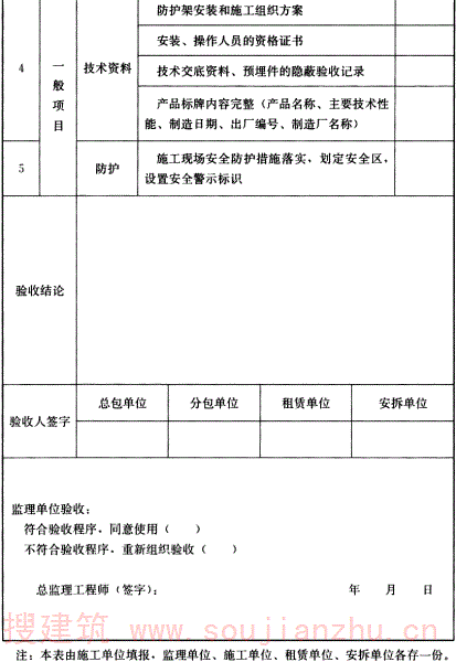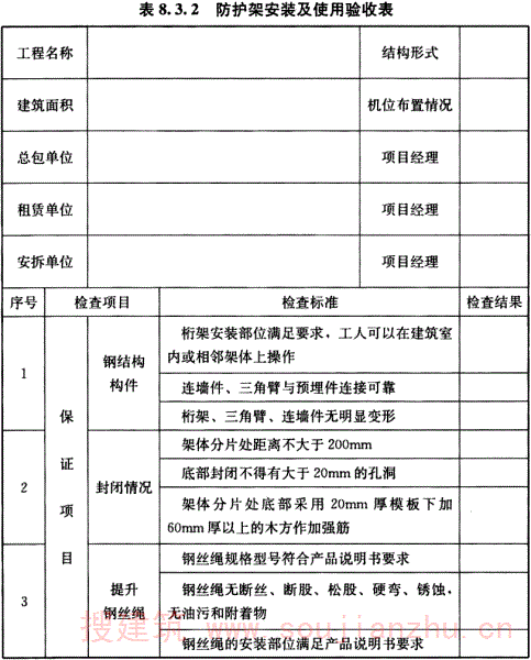 8.3.2 外挂防护架应按表8.3.2的规定逐项验收,合格后方可使用。