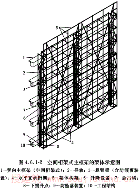 附着式升降脚手架的组成结构,一般由竖向主框架、水平支承桁架和架体构架等3部分组成。