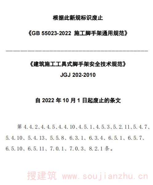 现批准《建筑施工工具式脚手架安全技术规范》为行业标准,编号为JGJ 202-2010,自2010年9月1日起实施。其中,第4.4.2、4.4.5、4.4.10、4.5.1、4.5.3、5.2.11、5.4.7、5.4.10、5.4.13、5.5.8、6.3.1、6.3.4、6.5.1、6.5.7、6.5.10、6.5.11、7.0.1、7.0.3、8.2.1条为强制性条文,必须严格执行。