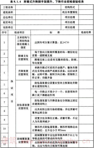 8.1.4 附着式升降脚手架提升、下降作业前应按表8.1.4的规定进行检验,合格后方可实施提升或下降作业。