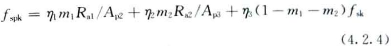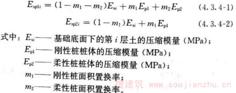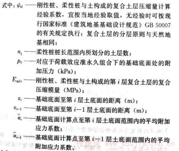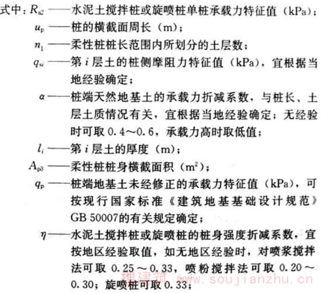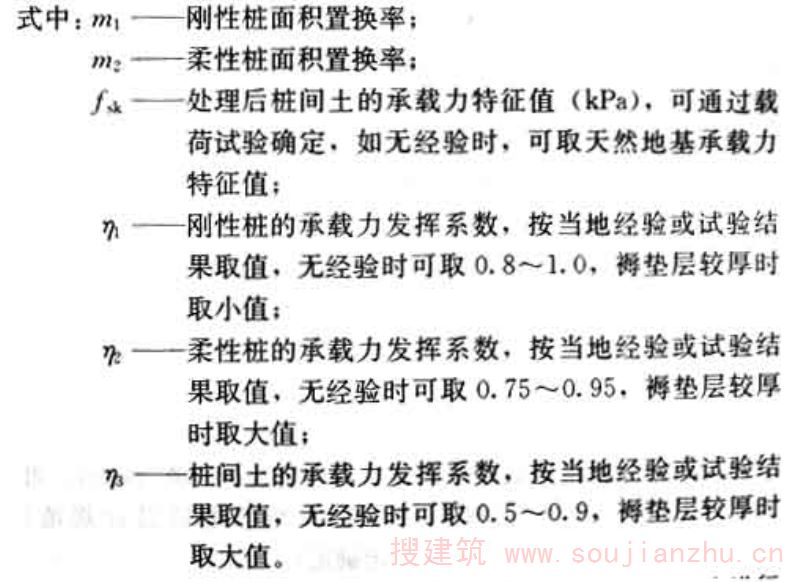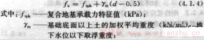 4.1.4 刚-柔性桩复合地基承载力的基础宽度承载力修正系数应取零;基础埋深的承载力修正系数应取1.0。修正后的复合地基承载力特征值? a 应按下式计算: