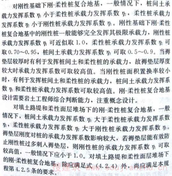 3.0.4规程规定刚-柔性桩复合地基中的刚性桩应选用摩擦型桩,是为了保证在建筑物使用过程中桩体和桩间土能够共同直接承担荷载。若刚性桩是端承桩,则难以保证在荷载作用下刚-柔性桩复合地基中的桩体和桩间土共同直接承担荷载。复合地基中的桩体和桩间土在荷载作用下能够共同直接承担荷载不仅指在荷载作用初期,而且指在建筑物整个使用过程。在刚-柔性桩复合地基设计中对此应予以充分重视。