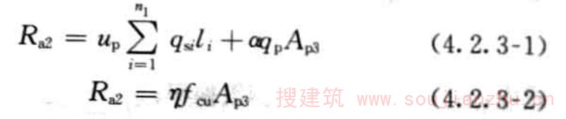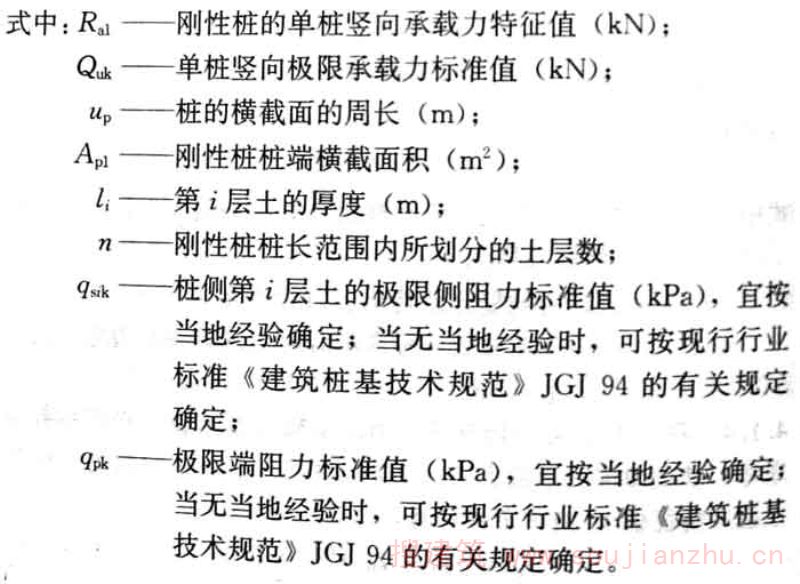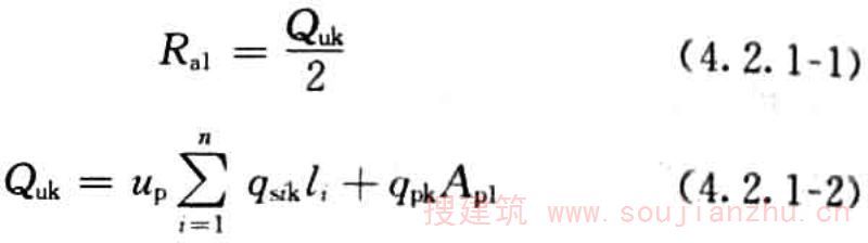 4.2.1 刚性桩的单桩承载力应按现场单桩静载试验确定。初步设计时也可按下列公式估算单桩竖向承载力特征值:
