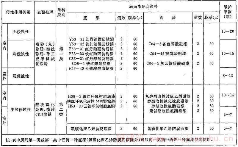 表D.0.2 常用防腐涂料底、面漆配套及维护年限