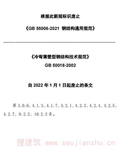 现批准《 冷弯薄壁型钢结构技术规范 》为国家标准,编号为GB 50018-2002,自2003年1月1日起实施。其中,第3.0.6、4.1.3、4.1.7、4.2.1、4.2.3、4.2.4、4.2.5、4.2.7、9.2.2、10.2.3条为强制性条文,必须严格执行。原《冷弯薄壁型钢结构技术规范》GBJ 18-87同时废止。