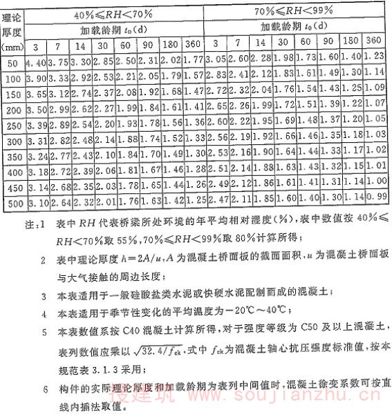 (t,t o )——加载龄期为t o ,计算考虑龄期为t的混凝土徐变系数。徐变系数最终值可根据混凝土桥面板的加载龄期和理论厚度按本规范表6.2.3采用。