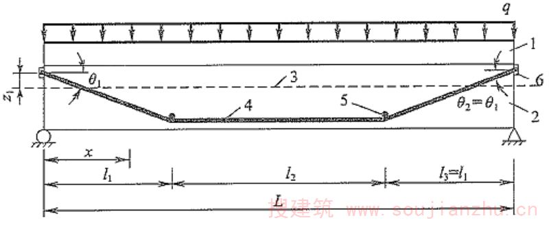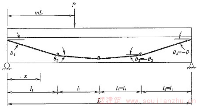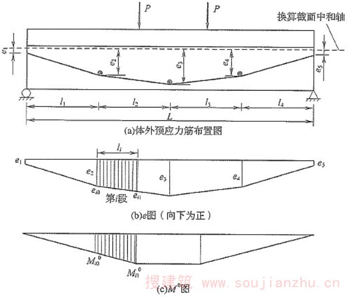 C.0.1 对于跨中无转向点的体外预应力组合梁的变形计算,以三折线形布筋形式为例(图C.0.1),其跨中挠度可按下列公式计算: