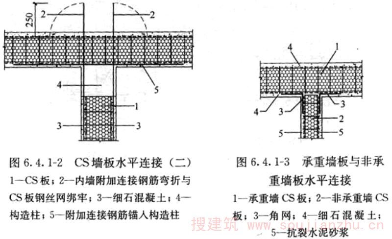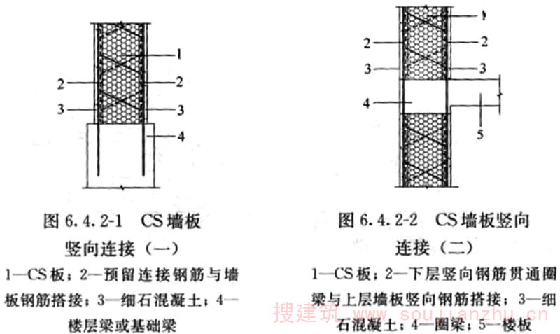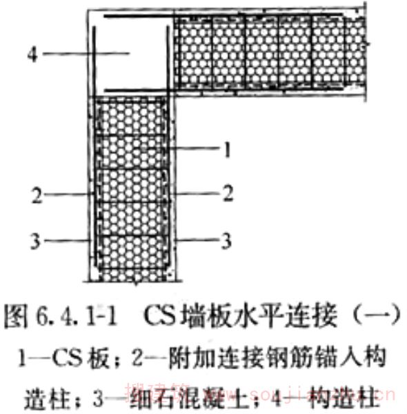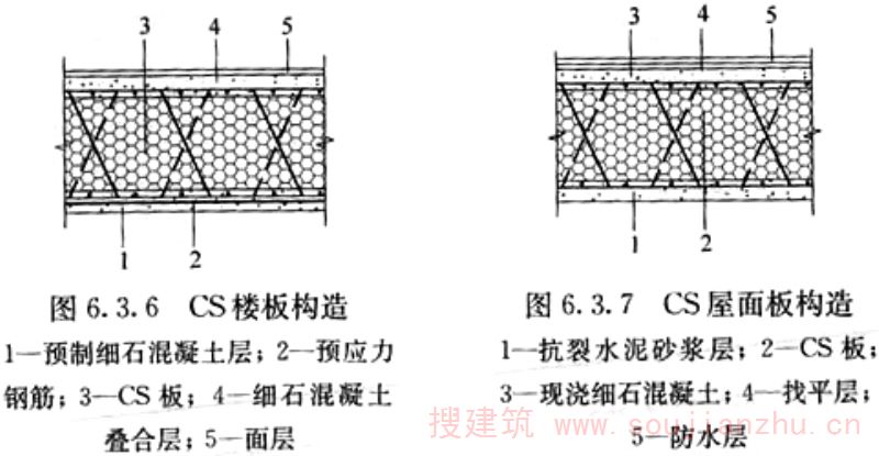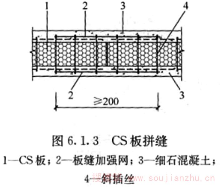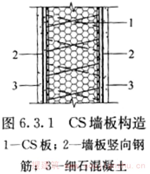 2.1.1 CS是“复合板”英文Composite Slab的缩写。钢丝网架混凝土复合板结构体系从研发到推广以及成果鉴定和有关批文,一直沿用“CS板式结构”的名称,故本规程中将钢丝网架混凝土复合板结构简称为CS板式结构。 CS板中间填充可用模塑聚苯乙烯泡沫塑料板(EPS)或岩棉板,其性能应符合相关规定的要求。