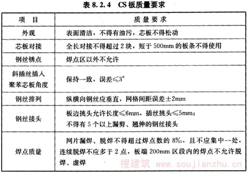 8.2.3 CS板钢丝网架斜插丝的焊点强度对于承重用的CS板是一项较重要的性能指标,本规程结合试验结果和工程实例,对钢丝网架斜插丝的焊点强度作了适当地提高。 当施工现场取样不方便时,可在工厂同条件下加工试件。