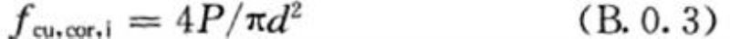 B.0.3 进行芯样试件的抗压强度试验时,先量测芯样试件的端面直径d和芯样试件的高度h,精确至0.1mm。以测得的极限荷载值P和芯样试件的直径d,按下式计算每一个芯样试件的抗压强度f cu,cor,i ,抗压强度精确至0.1MPa。
