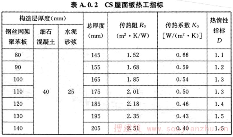 A.0.2 CS屋面板热工指标应按表A.0.2取用。