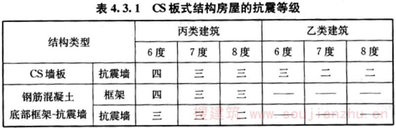 4.1.1 抗震设防的CS板式结构房屋应按现行国家标准《建筑工程抗震设防分类标准》GB 50223确定其抗震设防类别及抗震设防标准。